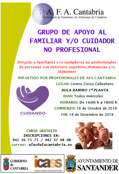 Informamos que el próximo miércoles 16 de Octubre comenzamos GRUPO DE APOYO AL CUIDADOR en el C.C. Callealtero de 16:00 a 18:00 gracias a la subvención que tenemos solicitada al Gobierno de Cantabria (ICASS). El programa va dirigido a familiares y/o cuidadores no profesionales de personas con deterioro cognitivo, demencias y/o Alzheimer de forma específica y es totalmente gratuito.