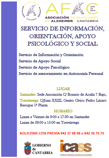 Se trata de un programa totalmente gratuito al cual se puede acceder bajo cita previa durante todo el año, y subvencionado por el Gobierno de Cantabria (ICASS). Lo único que hay que hacer para acceder es contactar con la asociación bien por teléfono o correo electrónico y aportar los siguientes datos personales: Nombre y dos Apellidos, DNI, fecha de nacimiento, y teléfonos de contacto. Estos datos serán: bien de la propia persona que contacta (que puede ser familiar, cuidador/a, persona con deterioro cognitivo, población general, profesionales…) En el caso de ser familiar y/o cuidador/a se le pedirán también los datos personales de la persona afectada por demencia y/o Alzheimer o deterioro cognitivo…Se procederá a su registro sistematizado y a la firma del documento de protección de datos.